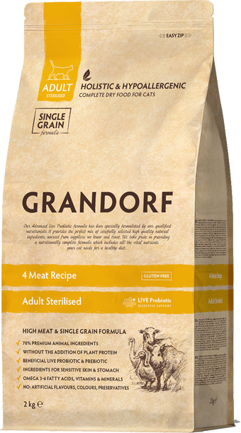 Aşağı yağ və yüksək protein tərkibi, həmçinin L-Karnitin sterilizasiya edilmiş və yaşlı ev heyvanlarında çəki və əzələ kütləsini optimal formada saxlamağa kömək edir.